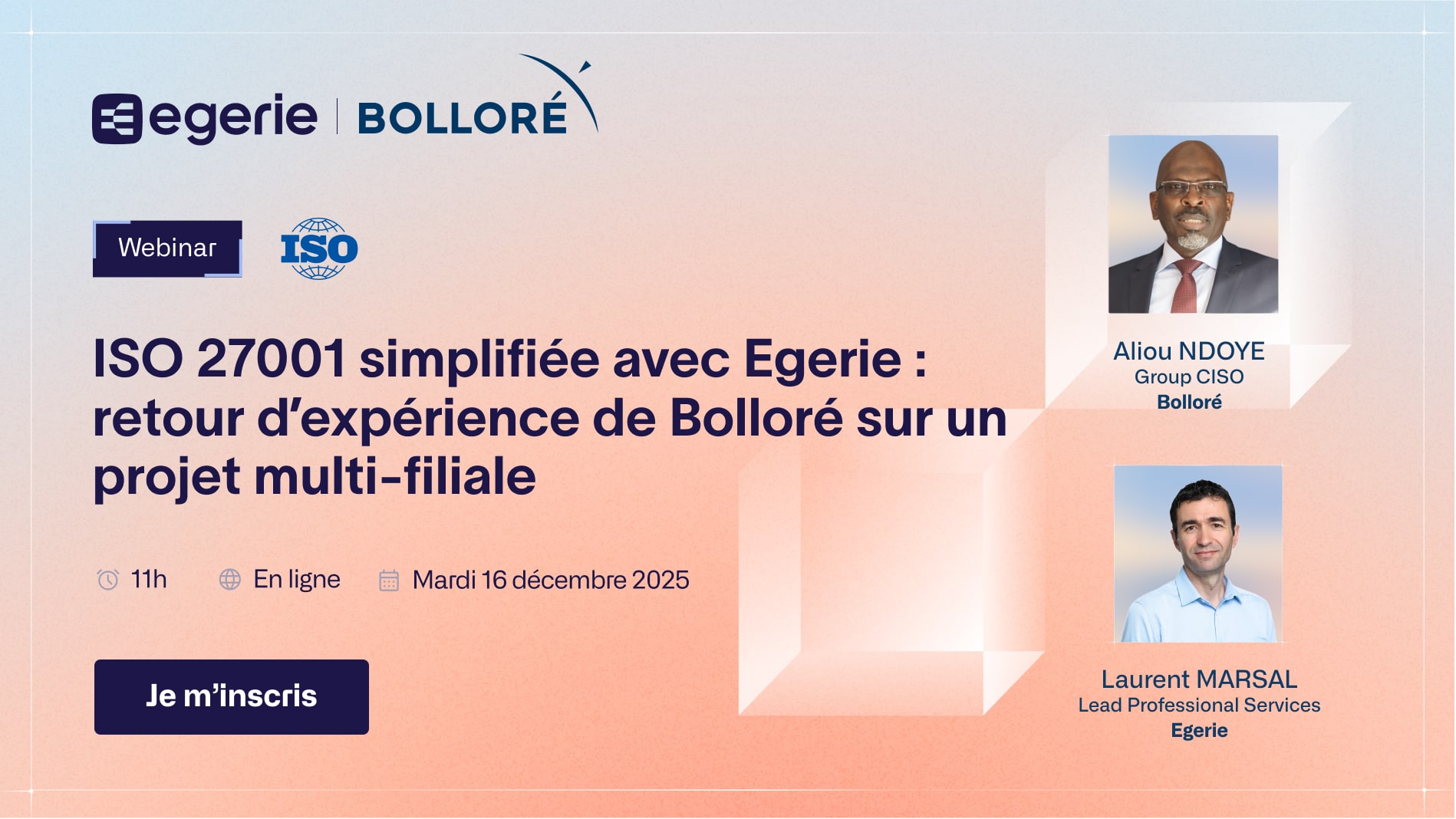Rejoignez notre webinar “ISO 27001 simplifiée avec Egerie” et voyez comment Bolloré a fait de la conformité un atout stratégique grâce à un déploiement ISO 27001 multi-filiale.